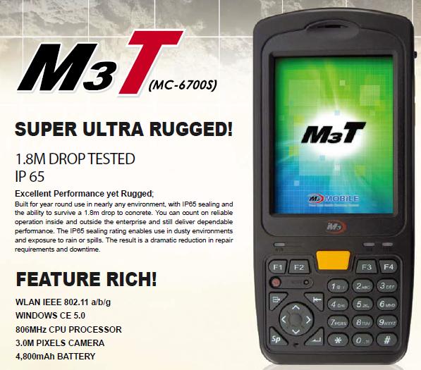 M3T 6700 el terminali, Windows CE 5.0 sistemine sahiptir. 520 hz işlemci, 256MB ram ve 1GB dahili hafıza ile sorunsuz bir şekilde programları çalıştırabilir. 1D barkodları okuyabilmektedir. M3T 6700 depo,market,sıcak satış,soğuk satış yazılımları için uygundur.